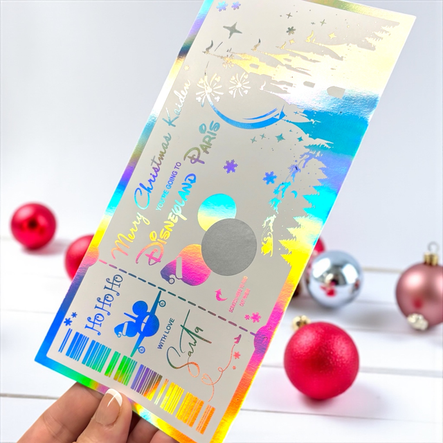 Christmas edition!šPrinted on heavy duty smooth card then foiled in your choice of foil colour scratch the panel in the Mickey Mouse ears to reveal the travel date! Comes with a free Kraft envelope or upgrade to a customised ribbon envelope (listed separately) Unique and stunning way to surprise your loved one and also a fab keepsake to keep in a keepsake box after the event.