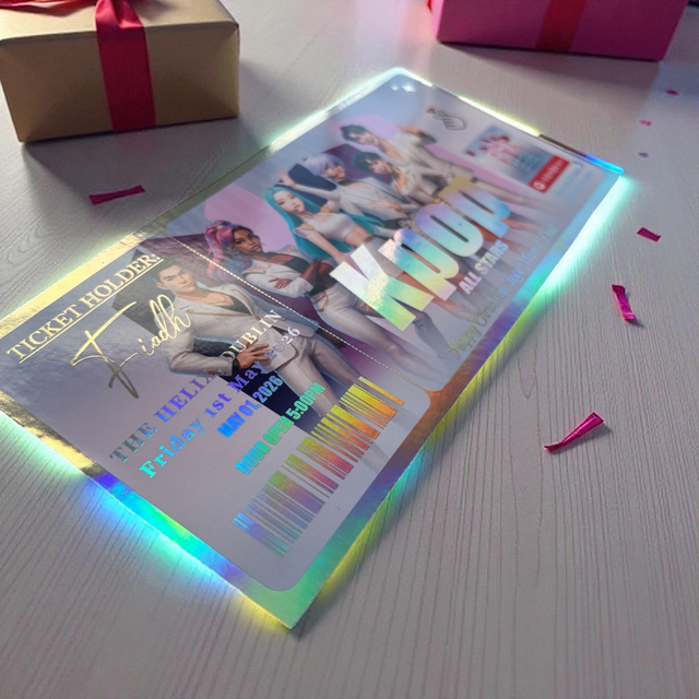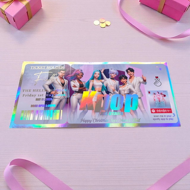 Kpop all stars gift ticket Printed on heavy duty smooth card then foiled in silver holo or gold holo (choose from drop down menu) with scanable Spotify code to the hit golden! Comes with a free Kraft envelope or upgrade to a customised ribbon envelope (listed separately) Unique and stunning way to surprise your loved one and also a fab keepsake to keep in a keepsake box after the event. Any concert/event is possible!