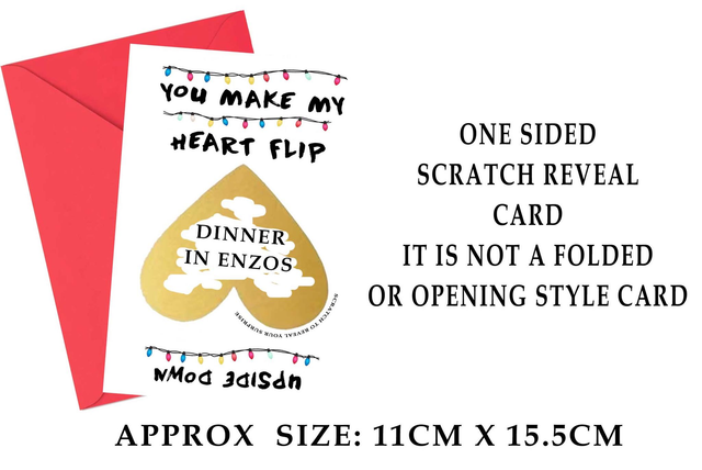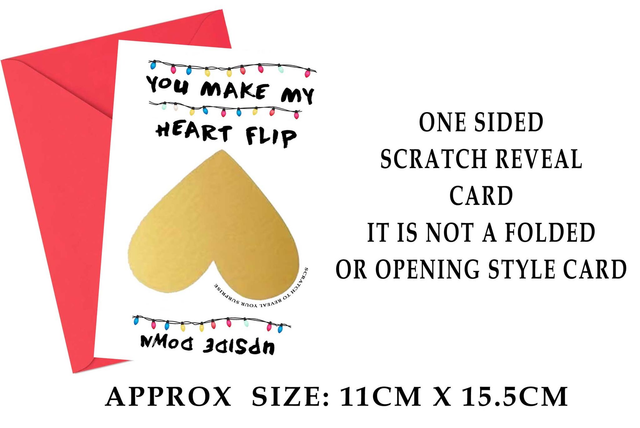 Printed on heavy duty smooth card approx 11cm x 15.5cm includes red envelope and gold heart scratch panel